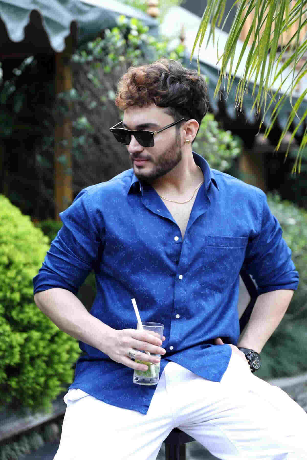 Cloud blue with white printed formal cotton shirt
