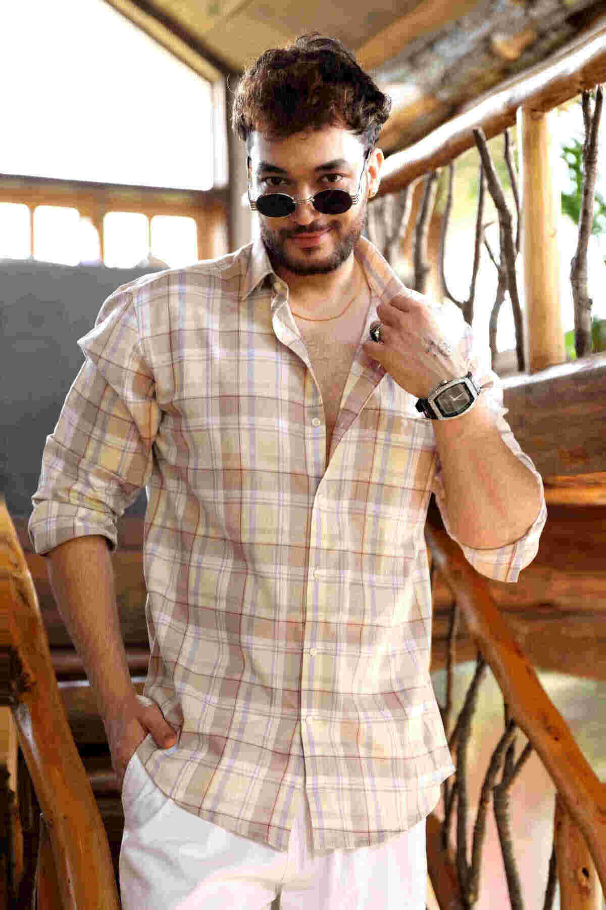 Biscuit cream with white check jute cotton shirt